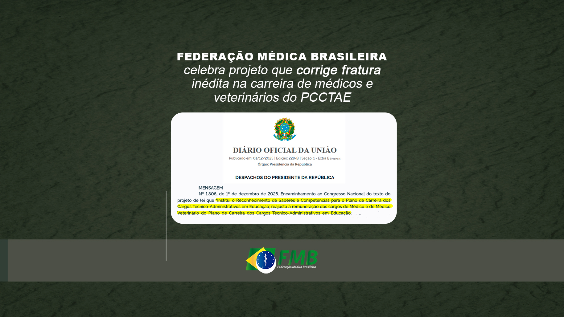 A Federação Médica Brasileira (FMB) e seus sindicatos de base celebram uma conquista importante para os médicos e médicos-veterinários das universidades e institutos federais vinculados à Carreira dos Cargos Técnico-Administrativos em Educação (PCCTAE). Após intenso tempo de atuação jurídica, política e entre entidades representativas, um Projeto de Lei que trata da reestruturação das carreiras da Educação foi encaminhado ao Congresso Nacional, contemplando o reajuste salarial e a valorização dessas categorias.