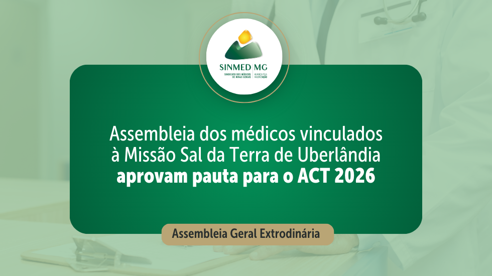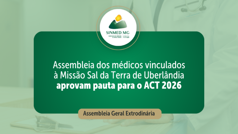 Em Assembleia Geral Extraordinária realizada por videoconferência pelo Sindicato dos Médicos de Minas Gerais (Sinmed-MG) no dia 5 de fevereiro de 2026, os médicos vinculados à Missão Sal da Terra (MSDT) em Uberlândia aprovaram a pauta de reivindicações para o Acordo Coletivo de Trabalho (ACT) 2026/2027.