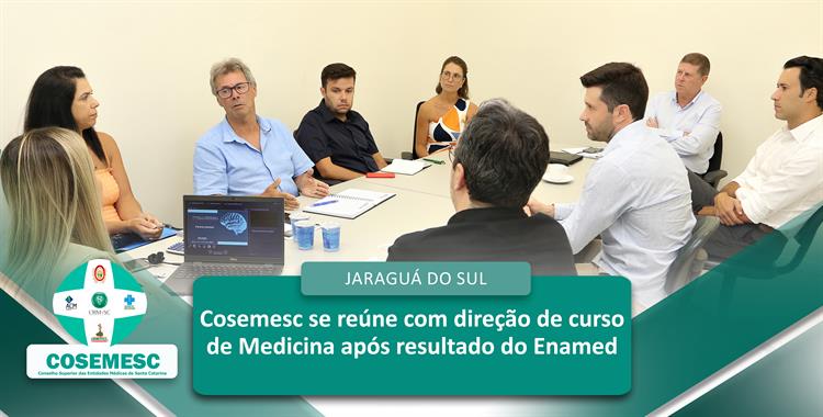 Representantes do Conselho Superior das Entidades Médicas de Santa Catarina (Cosemesc) estiveram reunidos com a direção do curso de Medicina do Instituto de Educação Médica (IDOMED), em Jaraguá do Sul, para dialogar sobre o resultado obtido pela instituição no Exame Nacional de Avaliação da Formação Médica (Enamed). O encontro teve como objetivo compreender os fatores que levaram ao mau desempenho registrado e conhecer as medidas que estão sendo adotadas para aprimorar a formação acadêmica e os resultados nas próximas avaliações.